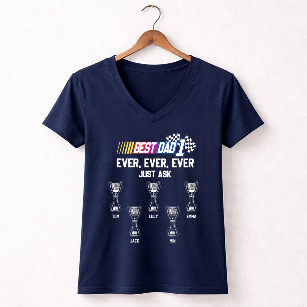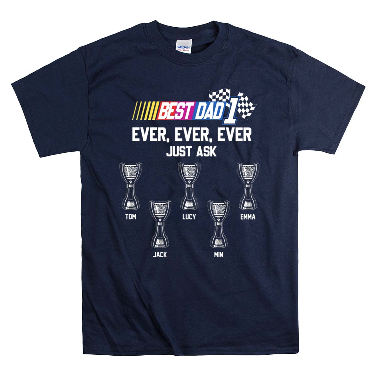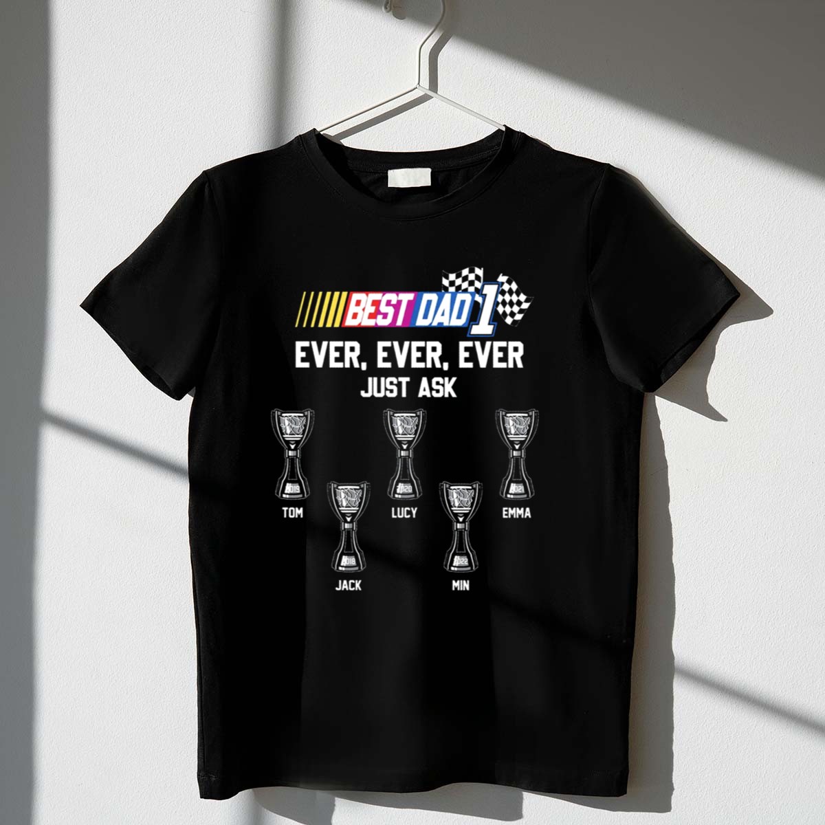This design is a joyful homage to fathers who are not just parents but champions in their children’s eyes. The playful phrase ‘BEST DAD 1 EVER, EVER, EVER JUST ASK’ adorned with racing trophies represents the fun and pride that comes with family connections and shared passions. It embodies the laughter and love shared during family race days, celebrating a dad’s legacy in a humorous light.