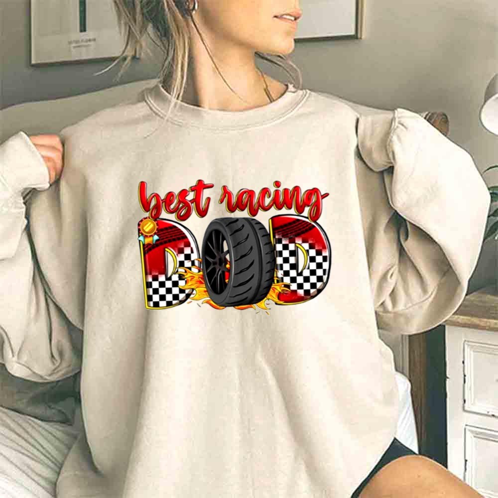 This design captures the exhilarating spirit of the racetrack, intertwining the thrill of racing with the pride of fatherhood. Featuring bold graphics of tires and checkered flags, it reflects the joy and excitement shared between dads and their kids. It’s a heartfelt celebration of their passion for motorsports and the cherished moments spent together.