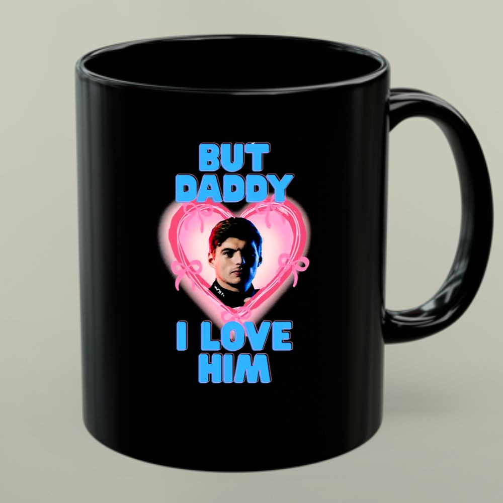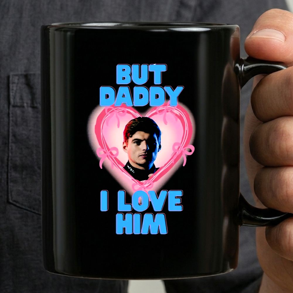 This mug showcases the sweet sentiment, ‘BUT DADDY I LOVE HIM,’ nestled within a heart that frames the silhouette of a racer. It embodies the playful spirit of a child’s love for their racing dad, creating a vibrant symbol of shared memories and heartfelt moments on and off the track. With its modern design, this piece reflects both passion for motorsport and the deep familial bond that thrives in the racing community.