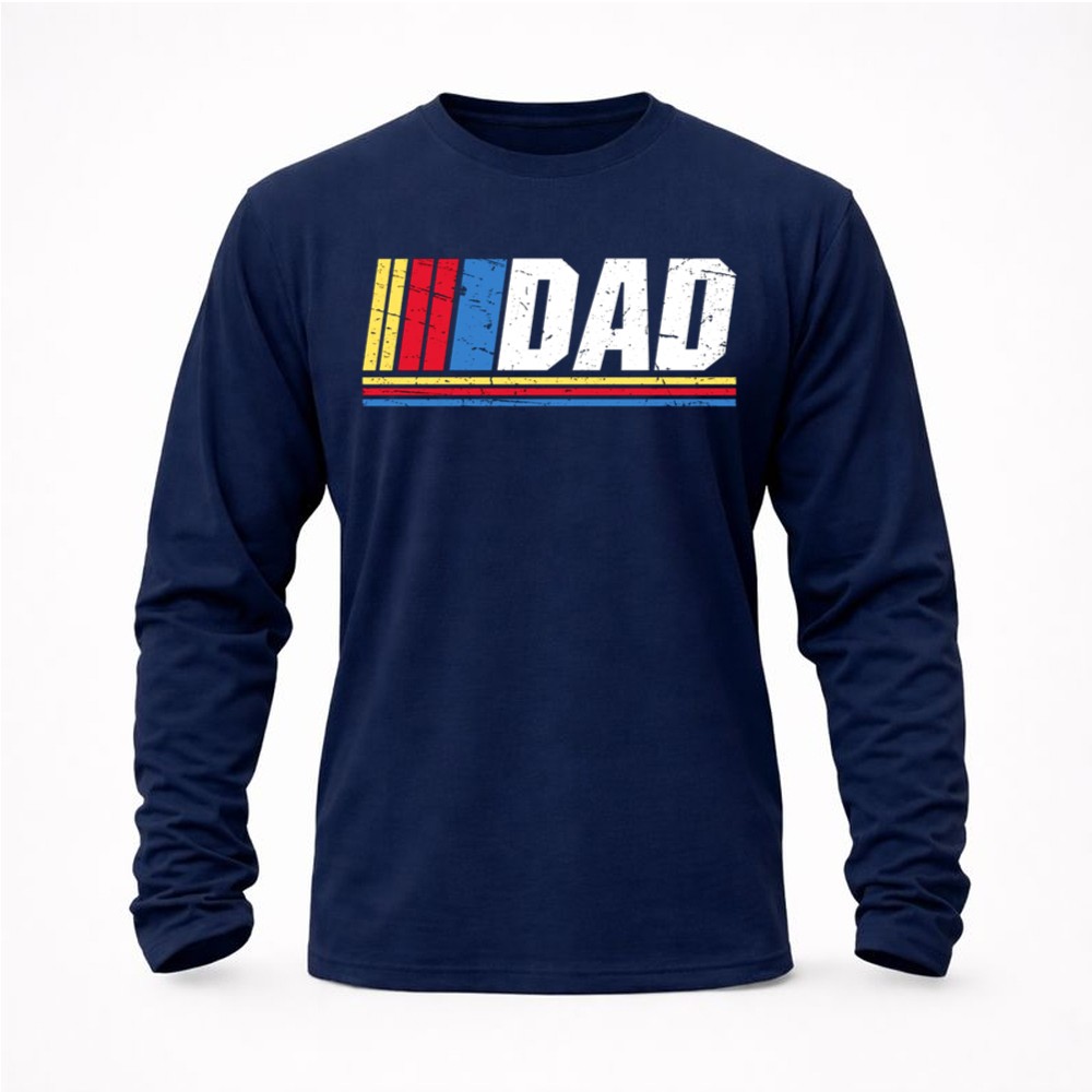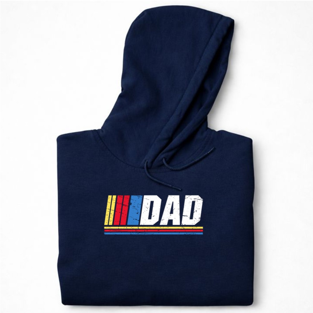This design captures the spirit of racing and the joy of fatherhood, combining bold ‘DAD’ lettering with classic NASCAR color stripes. It reflects the fun and camaraderie shared on race days, reminding us of the laughter and love found in family gatherings centered around a shared passion for motorsports.