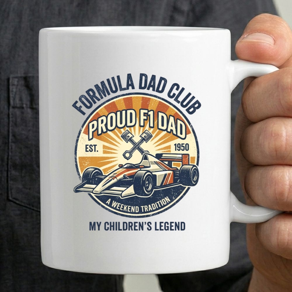 This design pays homage to the exhilarating world of Formula 1, where the roar of engines evokes a sense of pride and nostalgia for every racing dad. The bold graphic art and vintage aesthetic reflect a legacy of passion that transcends generations, celebrating the unique bond between fathers and their children in the context of motorsport culture.