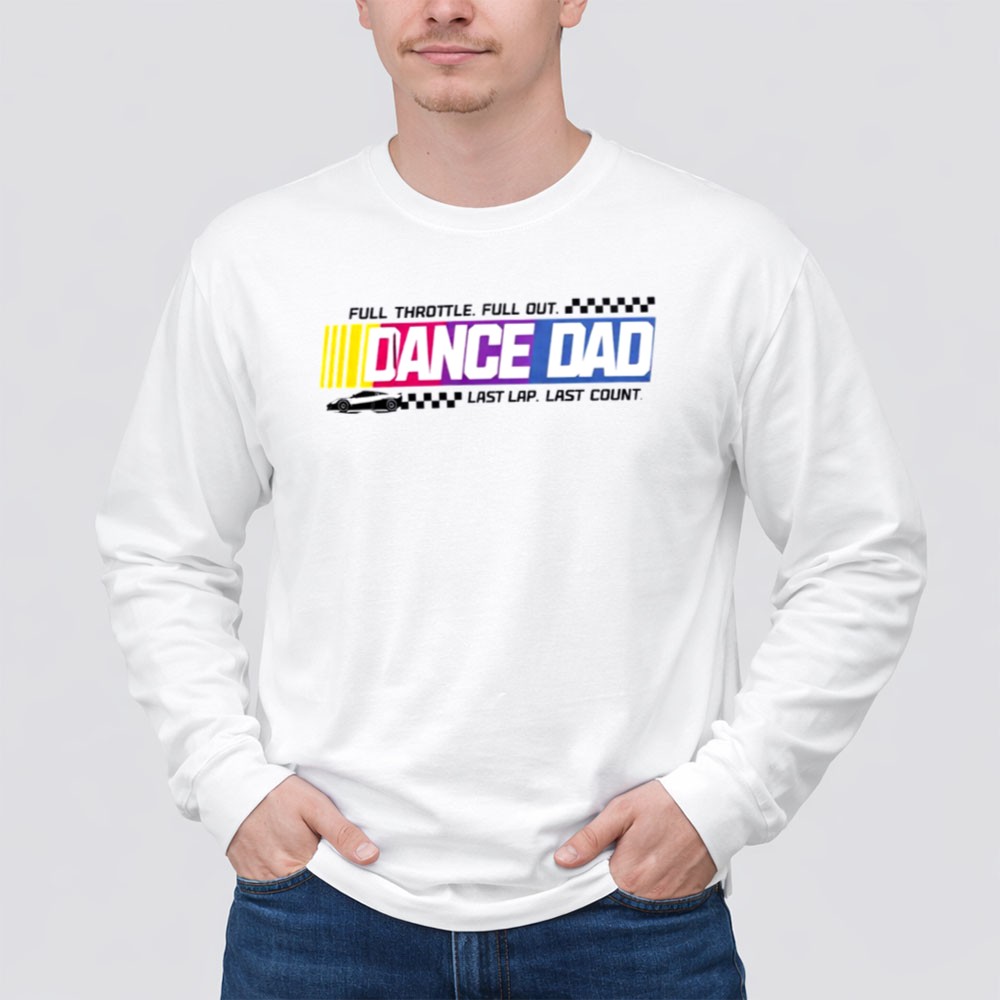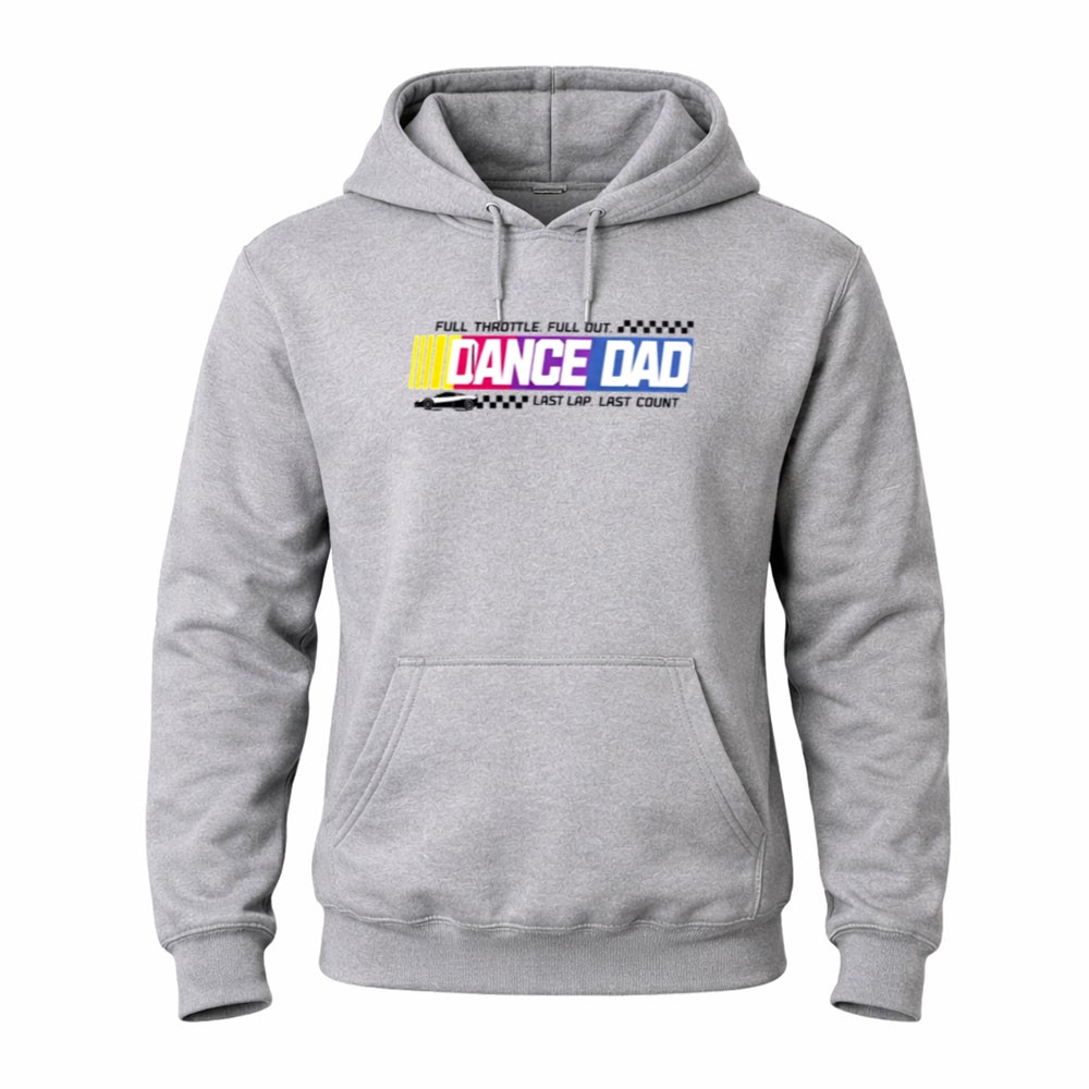 The design captures the essence of a racing dad’s journey, celebrating the unforgettable moments shared during family race days. With its vibrant colors and witty phrase, ‘FULL THROTTLE. FULL OUT. DANCE DAD. LAST LAP. LAST COUNT.’, it embodies the humor and passion that define both racing and fatherhood. This hoodie is more than just apparel; it’s a connection to cherished memories and family bonding.
