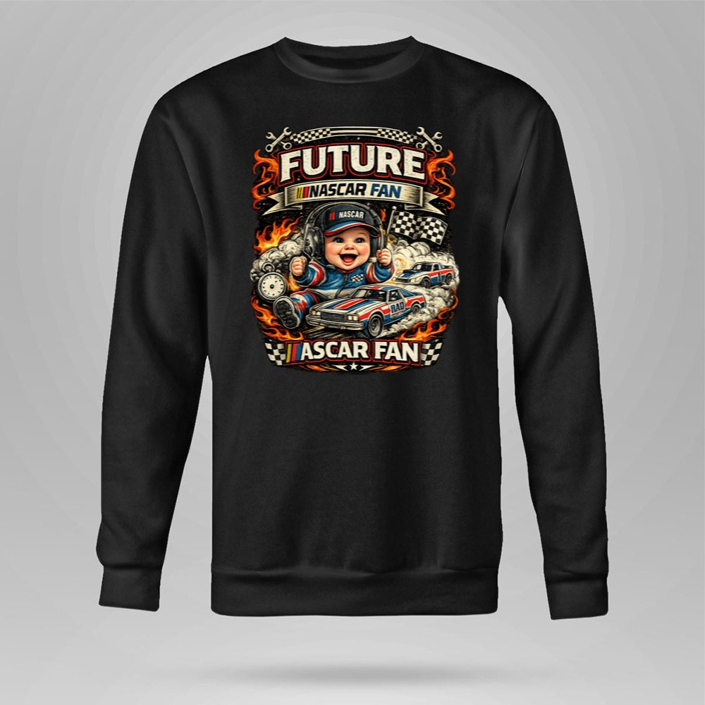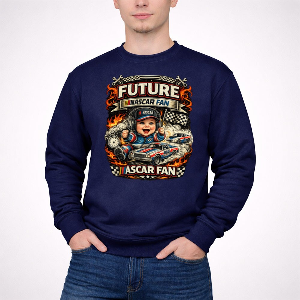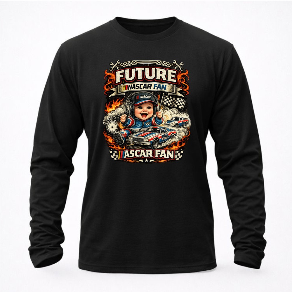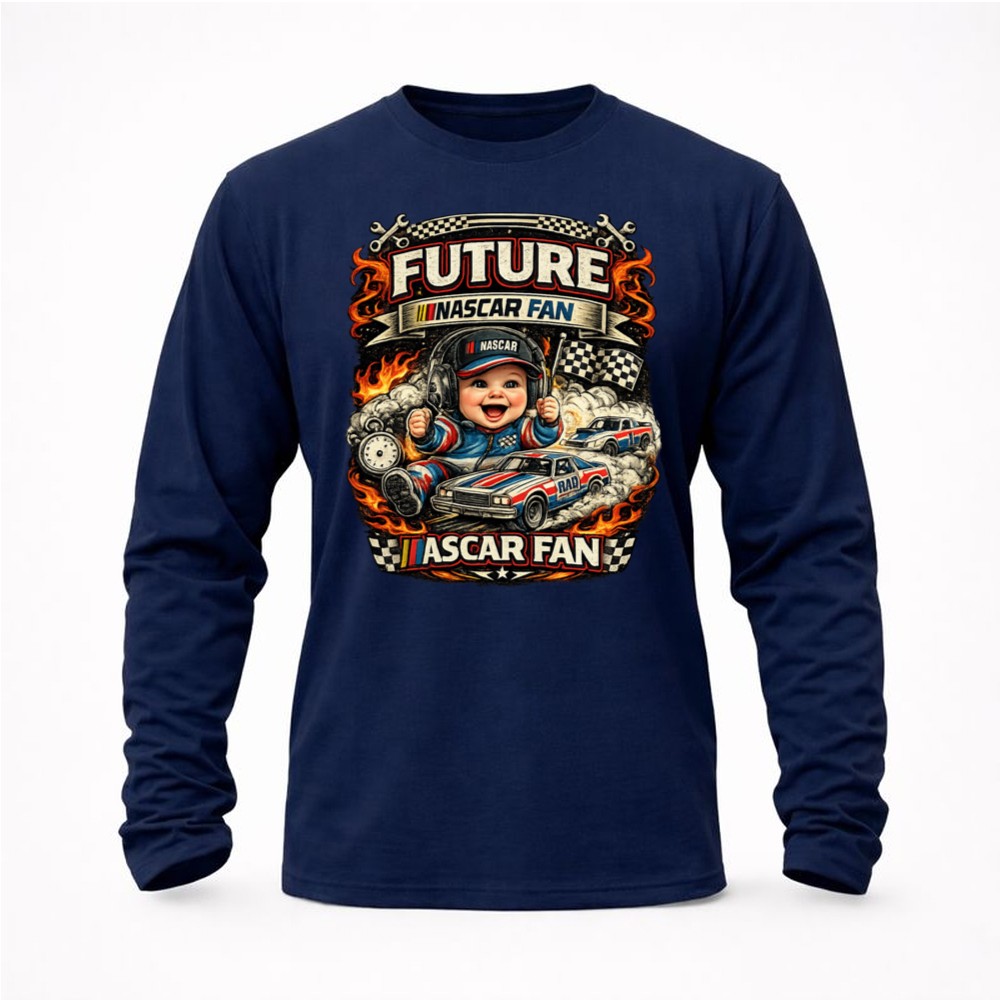 This design captures the essence of joy and family heritage in racing, showcasing an adorable baby in a helmet, ready to speed into the future. With colorful flames and checkered flags, it embodies the spirit of NASCAR and the laughter shared among racing fans. It’s a delightful way to celebrate the next generation of speed lovers.