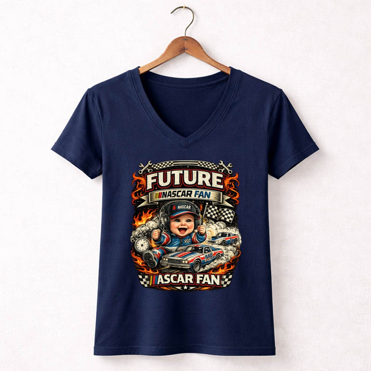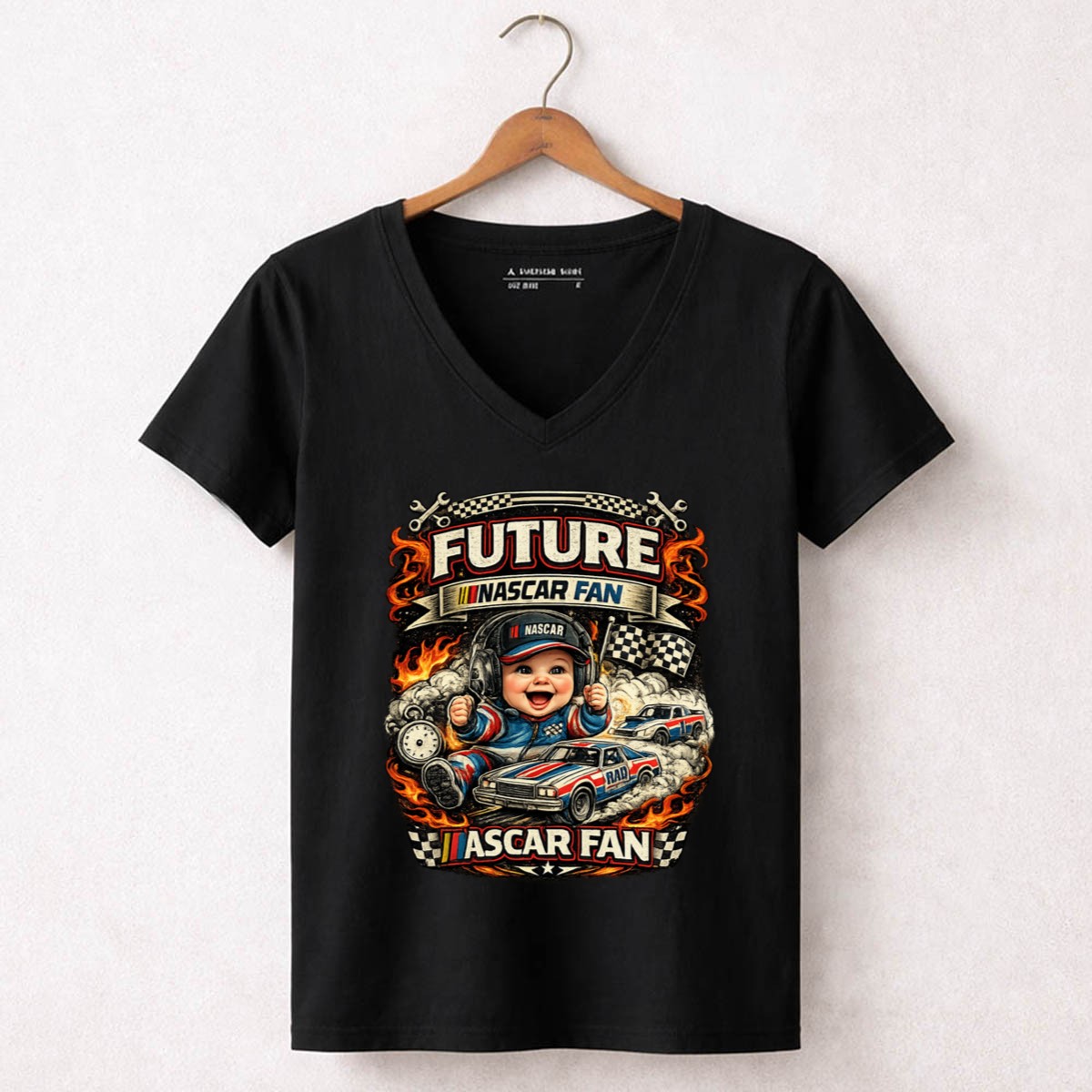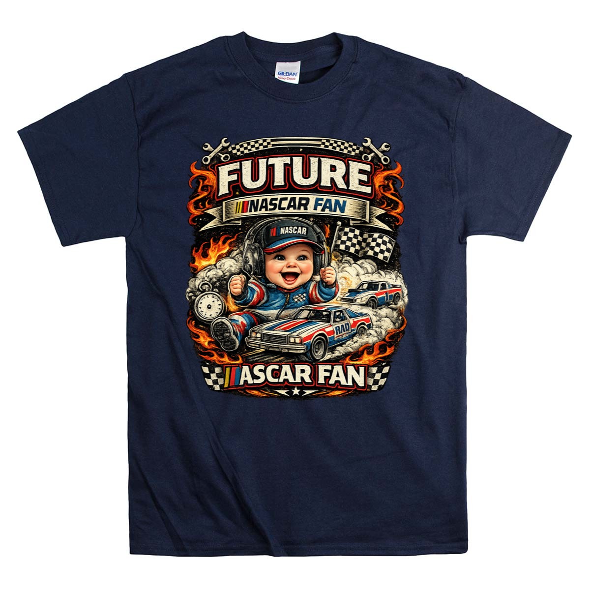 This delightful design showcases a jubilant baby dressed in racing gear, surrounded by vibrant flames and classic race cars. It reflects the joy of nurturing a future NASCAR fan, celebrating the excitement and pride that comes from sharing family racing traditions. The playful cartoon style and vibrant colors evoke a sense of humor and warmth, making it a cherished piece for any young racing enthusiast.