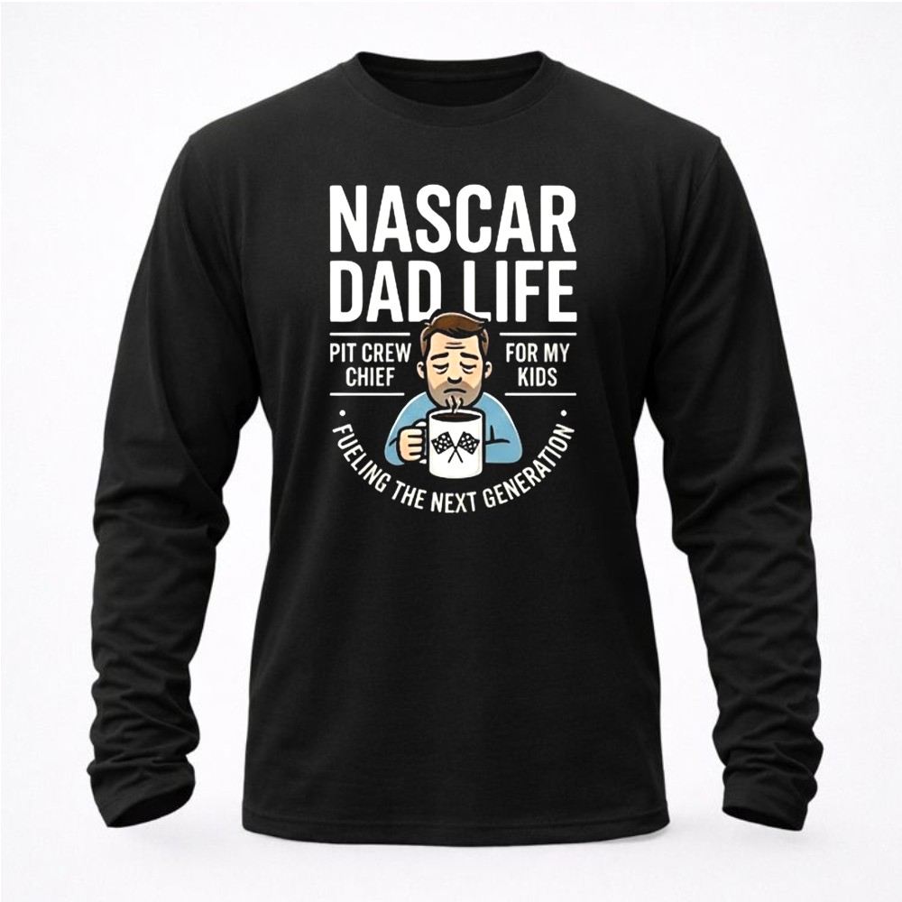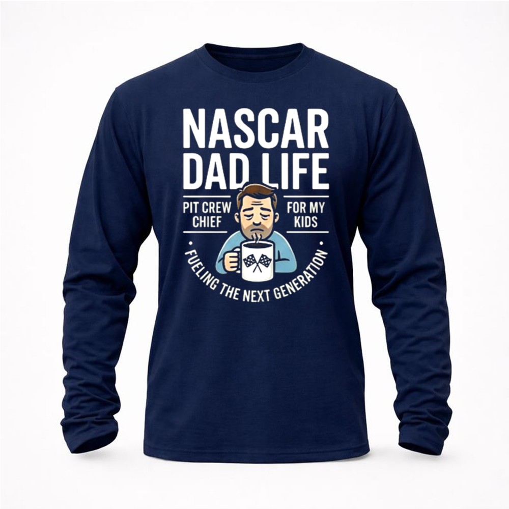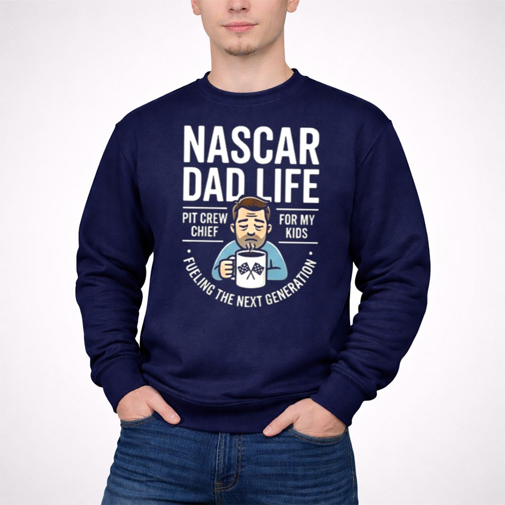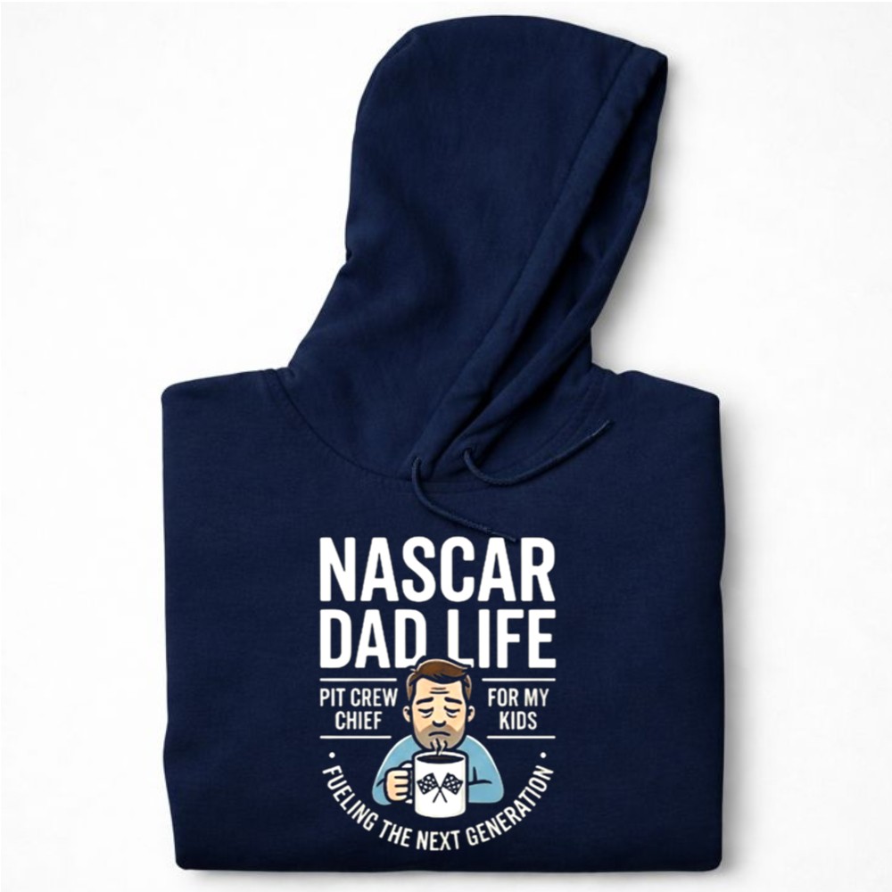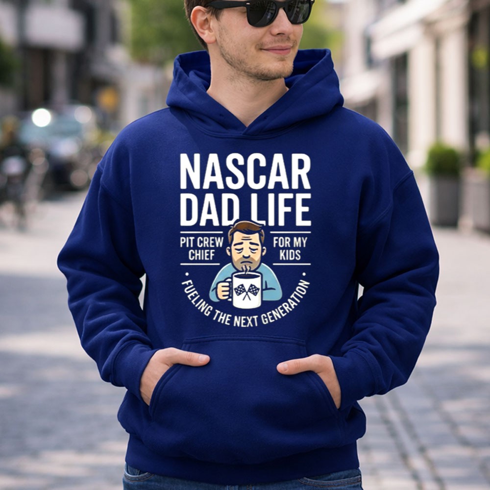 This design reflects the heartwarming connection between a dad and his children, embodying the essence of NASCAR Dad Life. With bold typography and playful graphics, it celebrates the joy of sharing a passion for racing in a way that’s both humorous and family-oriented. It’s not just a hoodie; it’s a tribute to the memories made on race days and the laughter shared while fueling the next generation of fans.