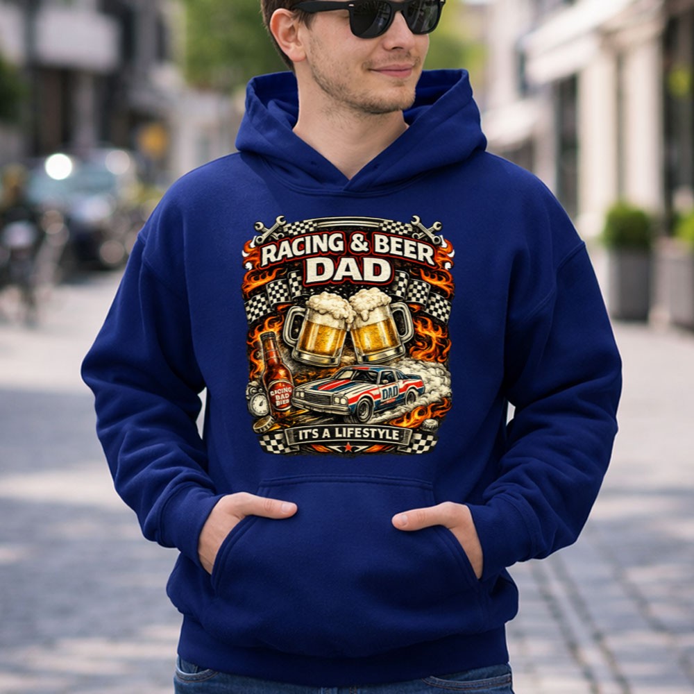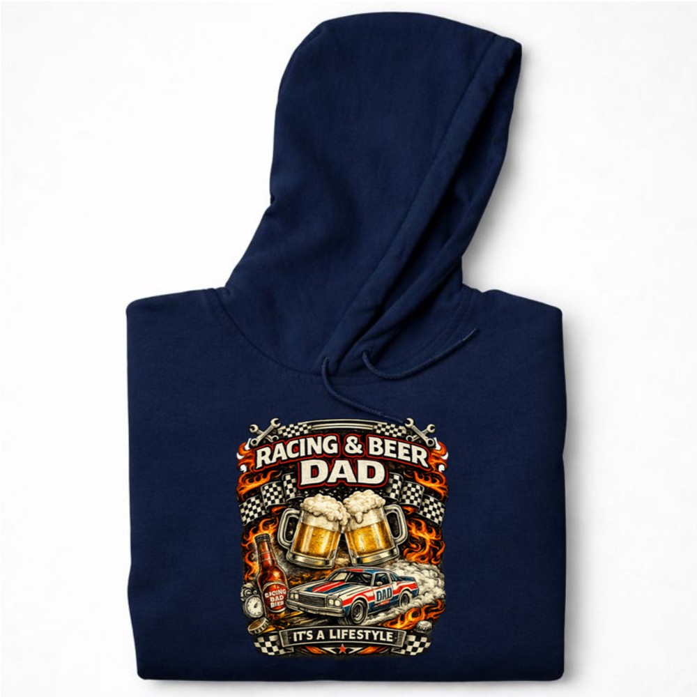 This design captures the exhilarating spirit of racing and the camaraderie shared over a cold beer. It’s a vibrant homage to the lifestyle of racing dads who celebrate both their passions and the joy of fatherhood. With bold graphics that tell a story, this hoodie is a reminder of the unforgettable moments spent cheering at the track or sharing laughs at a barbecue.