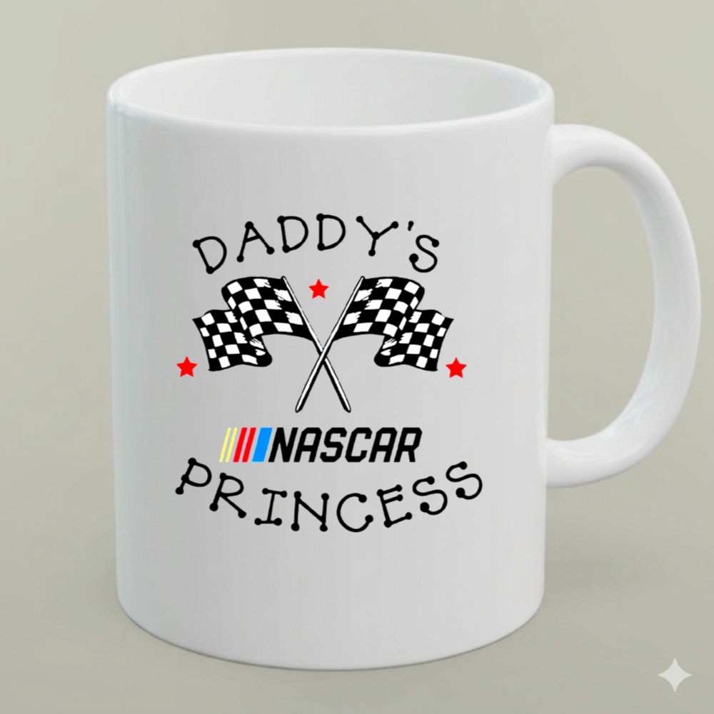 The ‘DADDY’S PRINCESS’ design beautifully merges the thrill of NASCAR with the deep affection shared between a father and daughter. With checkered flags dancing around the playful typography, this mug captures the joy and excitement of race day mornings, making each sip a celebration of family pride and racing passion.