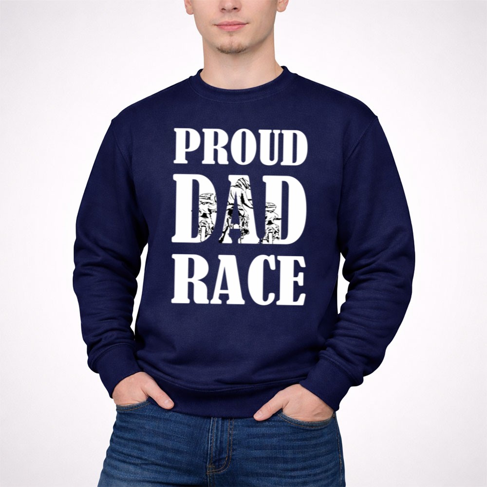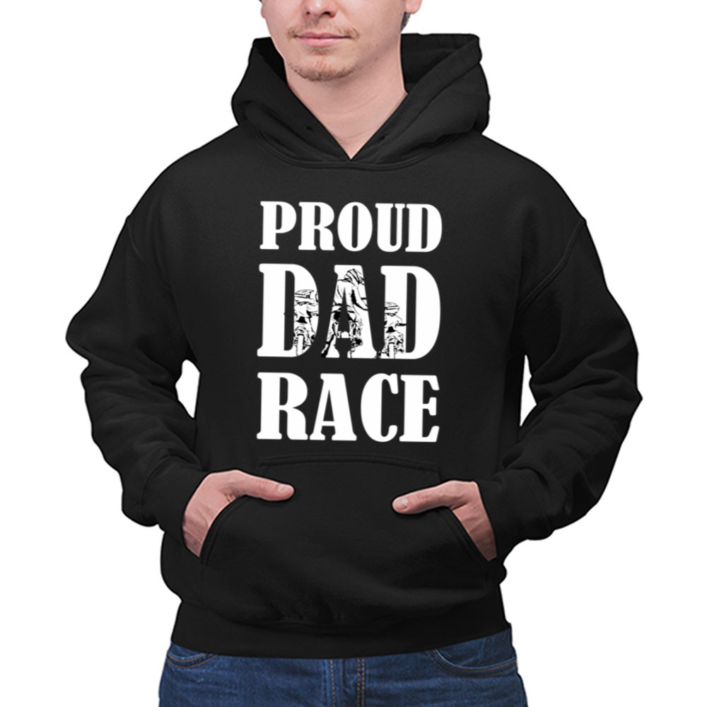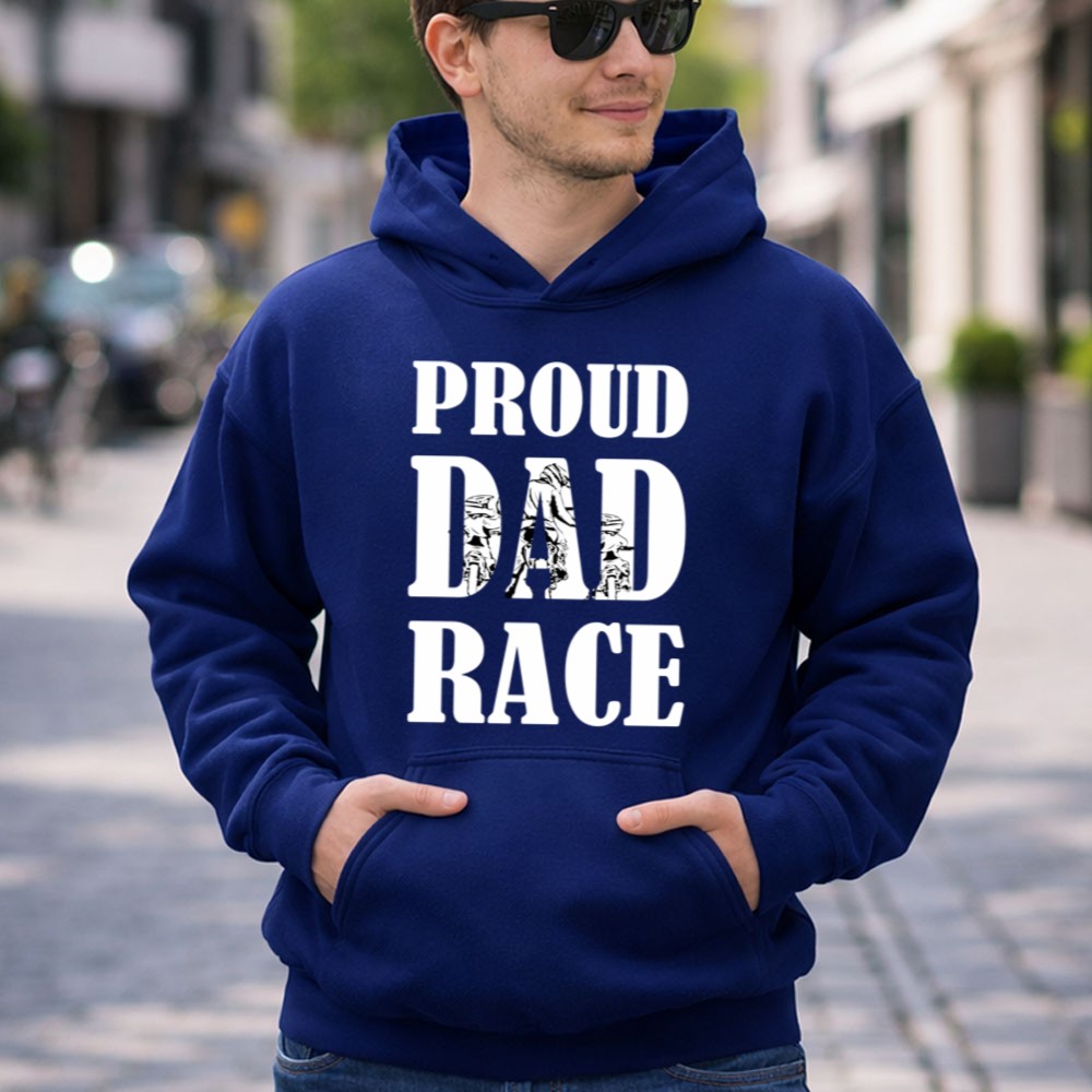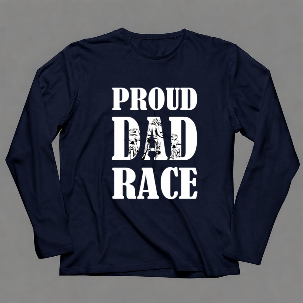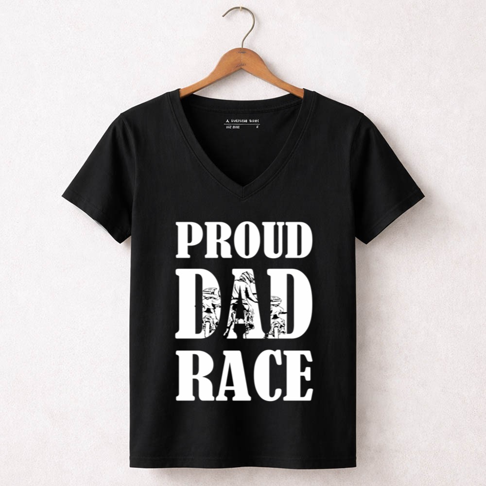 The ‘PROUD DAD RACE’ design embodies the joy and pride that comes with fatherhood. Its bold typography and minimalist style reflect a modern, casual aesthetic that resonates with dads celebrating special moments with their kids. This shirt is not just apparel; it’s a tribute to the unforgettable experiences shared on race days and family outings.