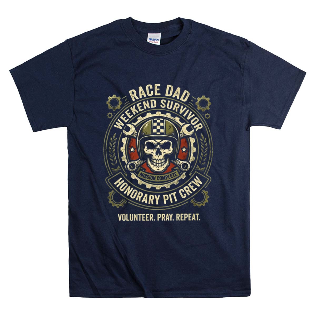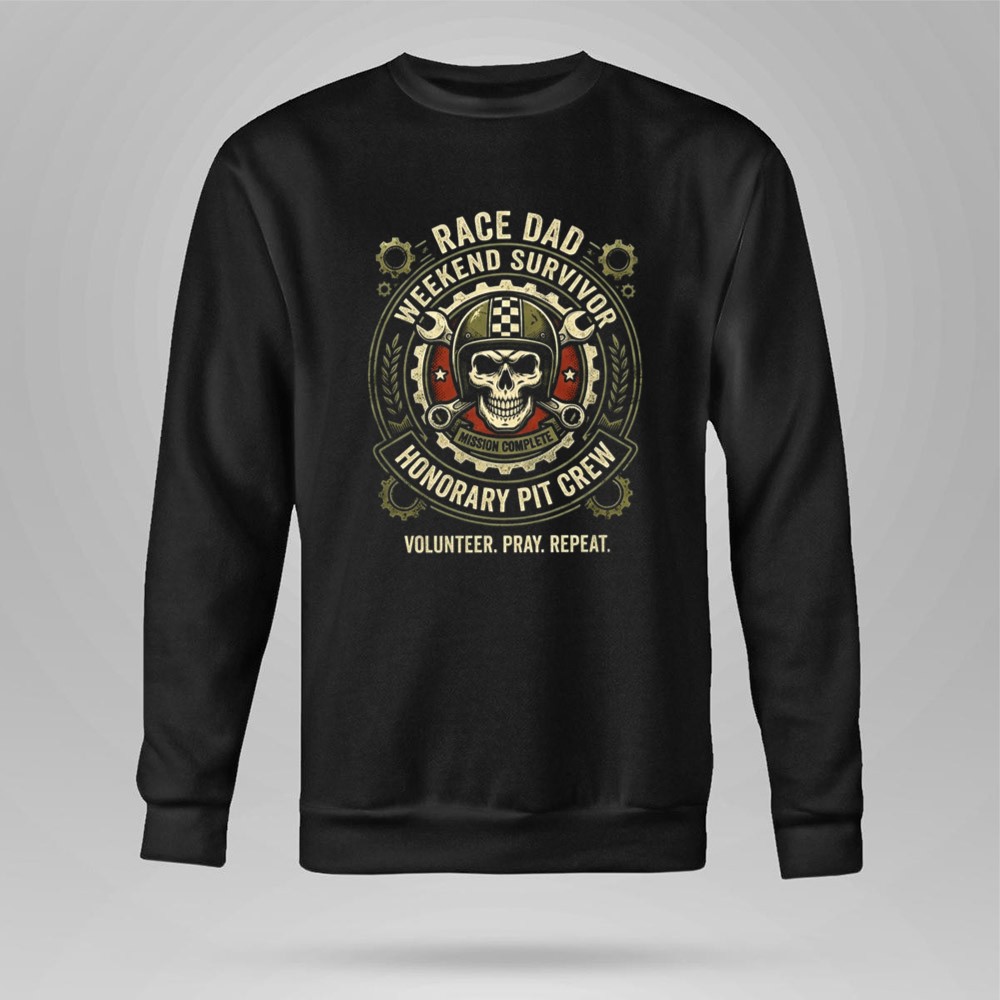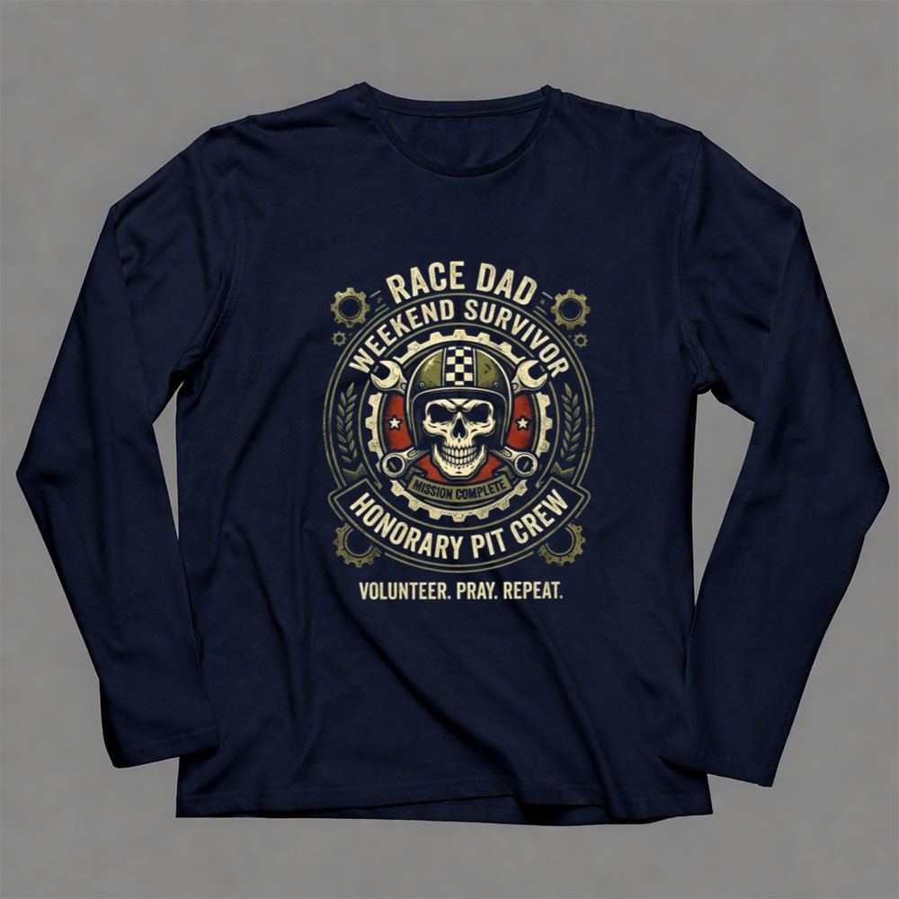 The ‘Race Dad Weekend Survivor Honorary Pit Crew’ design encapsulates the essence of racing culture and the heartfelt dedication of fathers who stand by their families during thrilling motorsport events. With a striking skull emblem and bold graphics, it pays tribute to the tireless volunteers who contribute to every race, reflecting a spirit of camaraderie and pride.