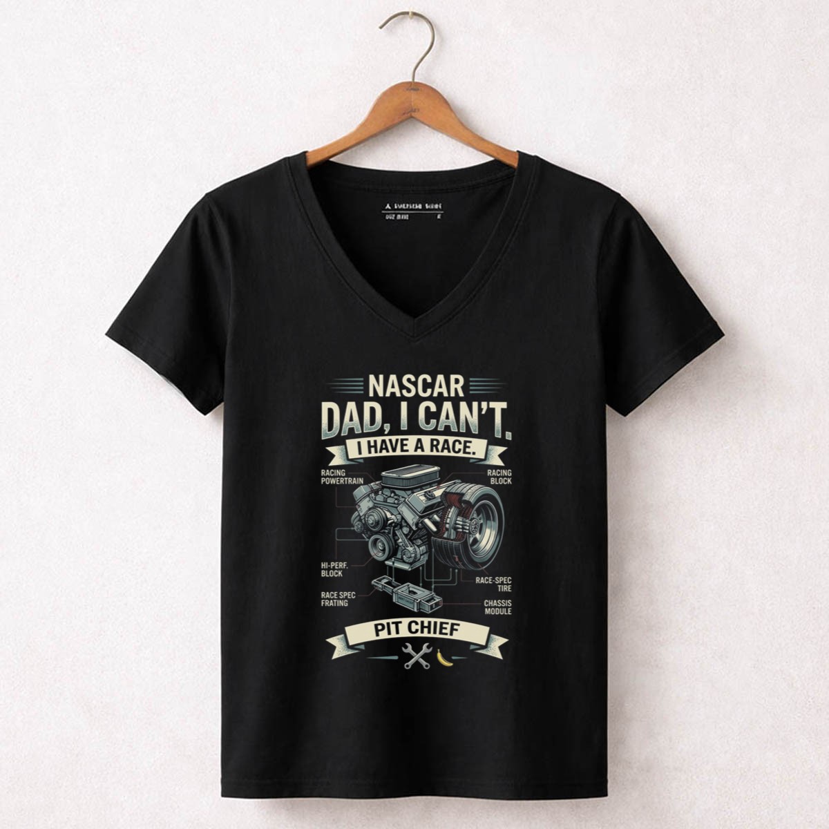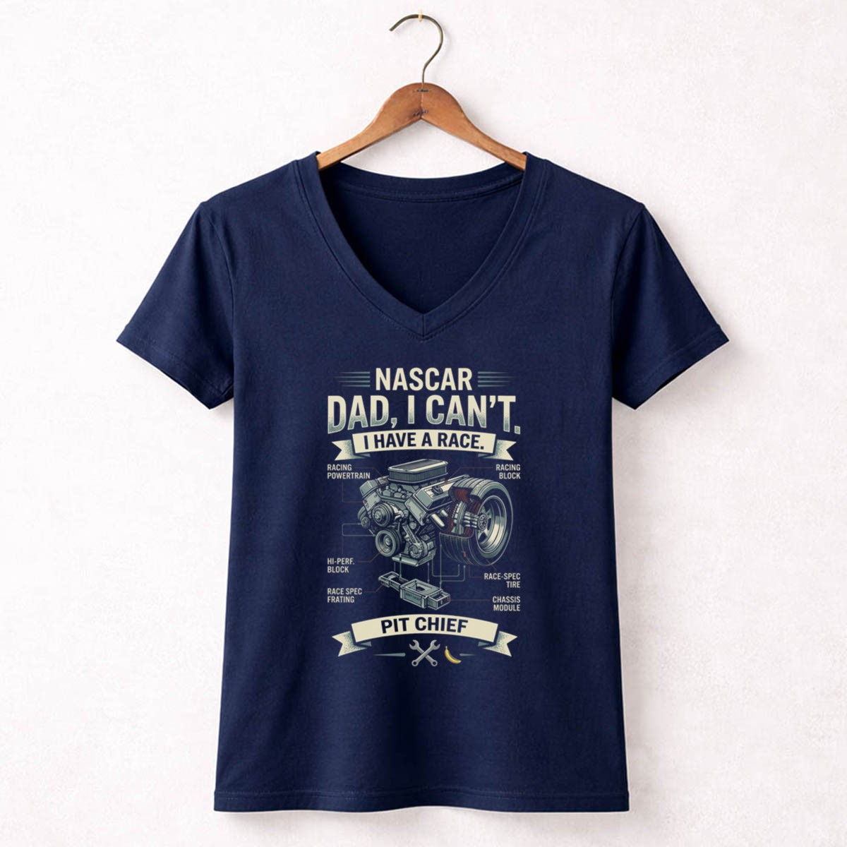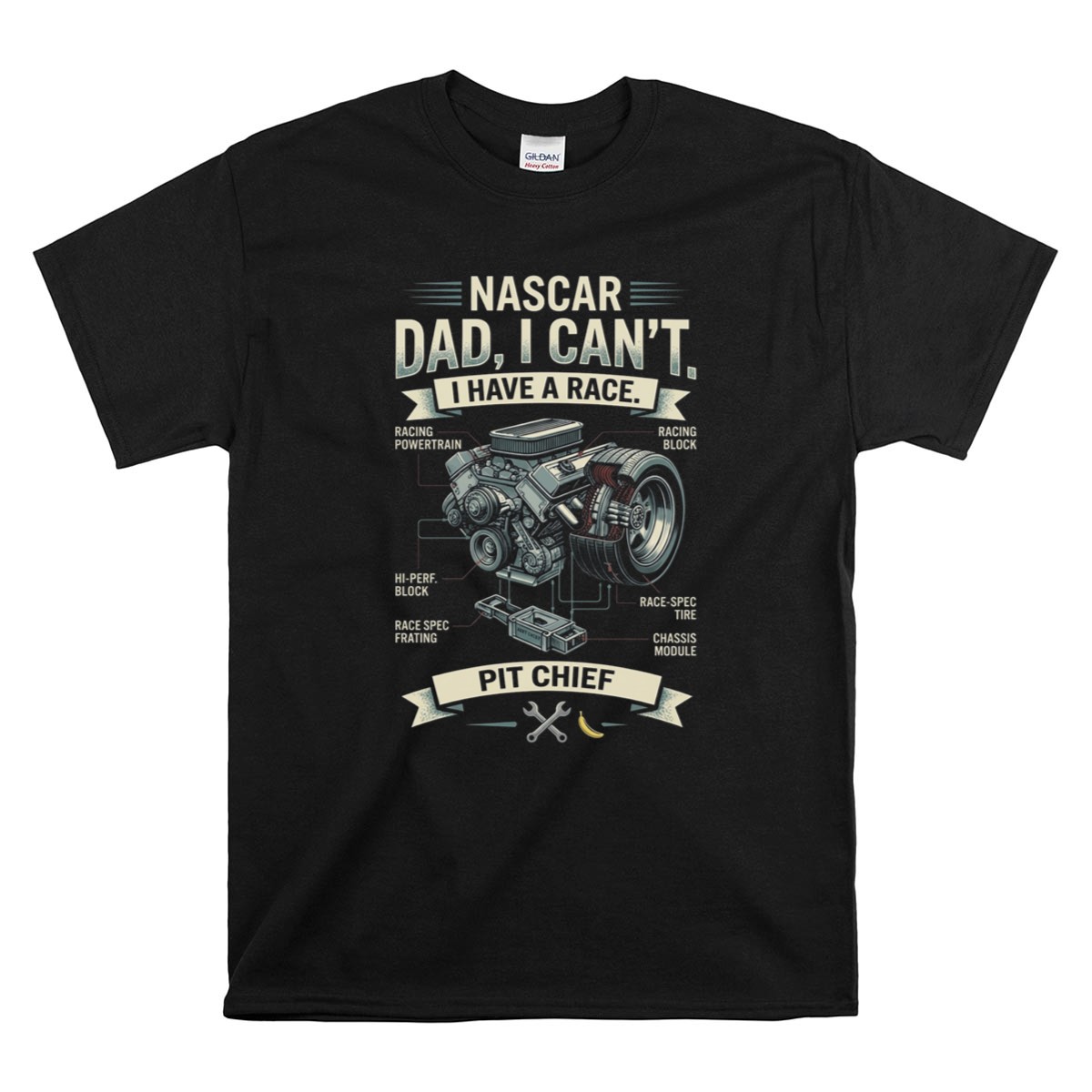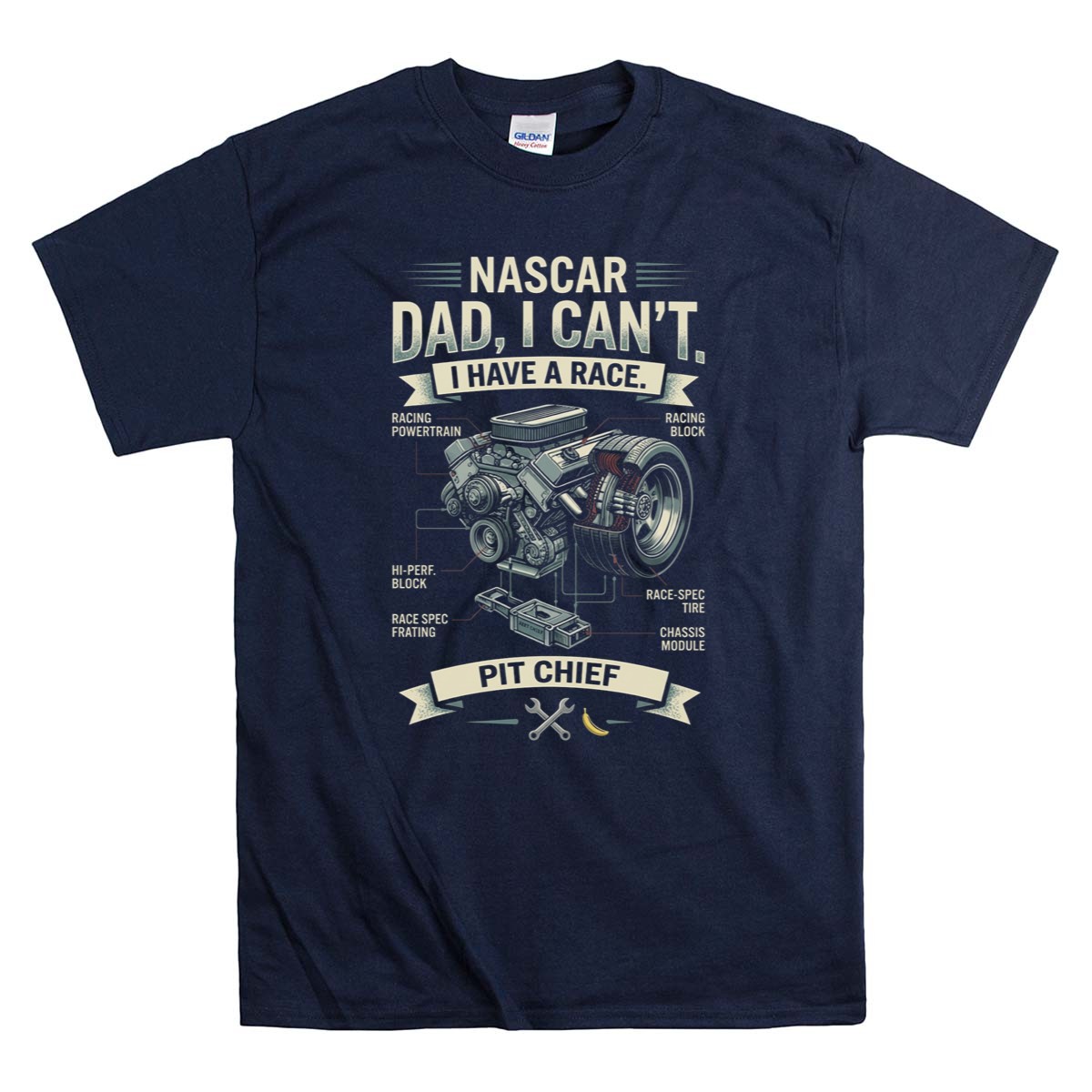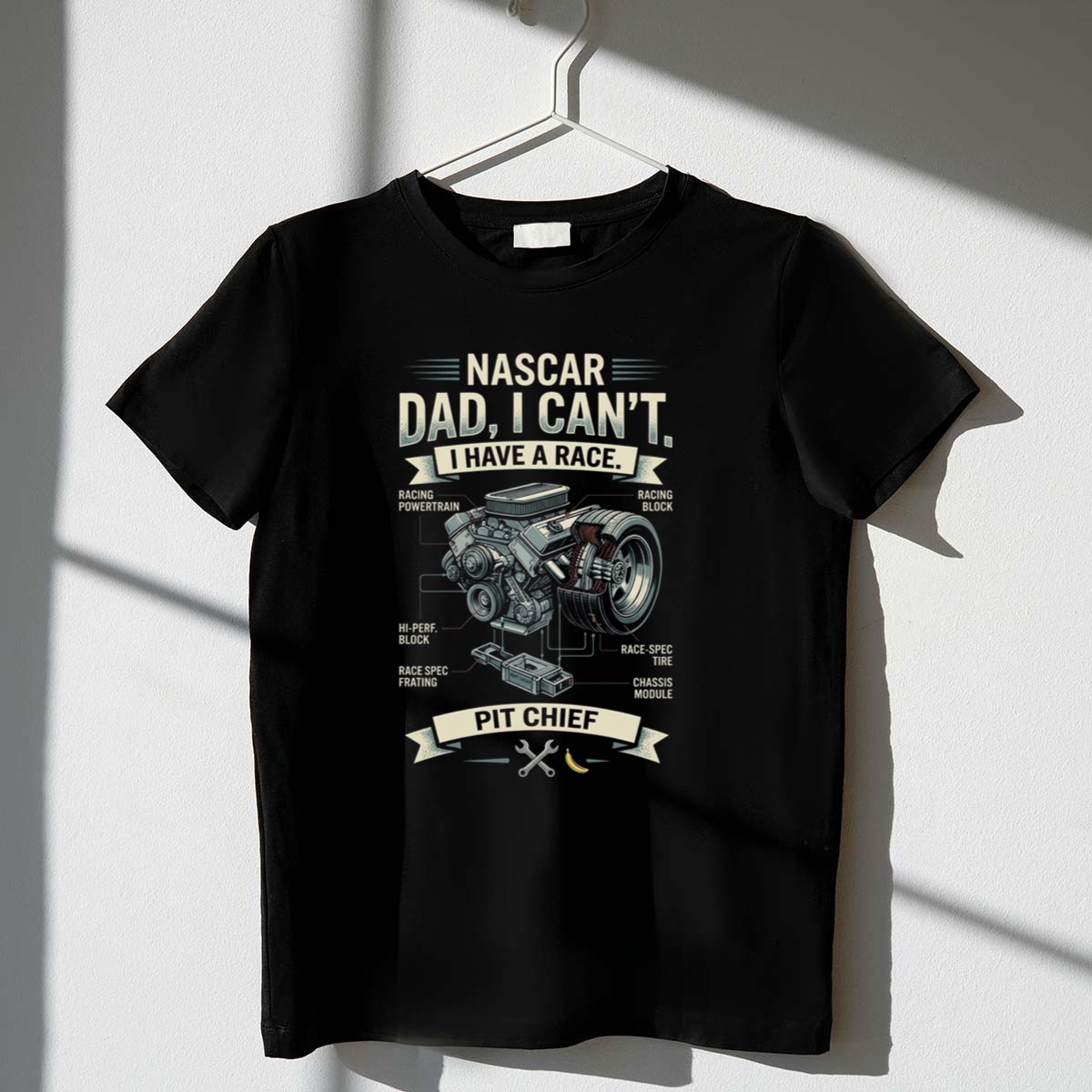 This design captures the essence of a racing dad’s dedication and love for the sport. The playful quote, ‘NASCR Dad, I Can’t. I Have a Race. PIT CHIEF,’ reflects the humorous side of being a pit chief, while the vintage graphic illustration embodies a nostalgic connection to motorsport traditions. It’s a celebration of family pride and the exhilarating world of racing.